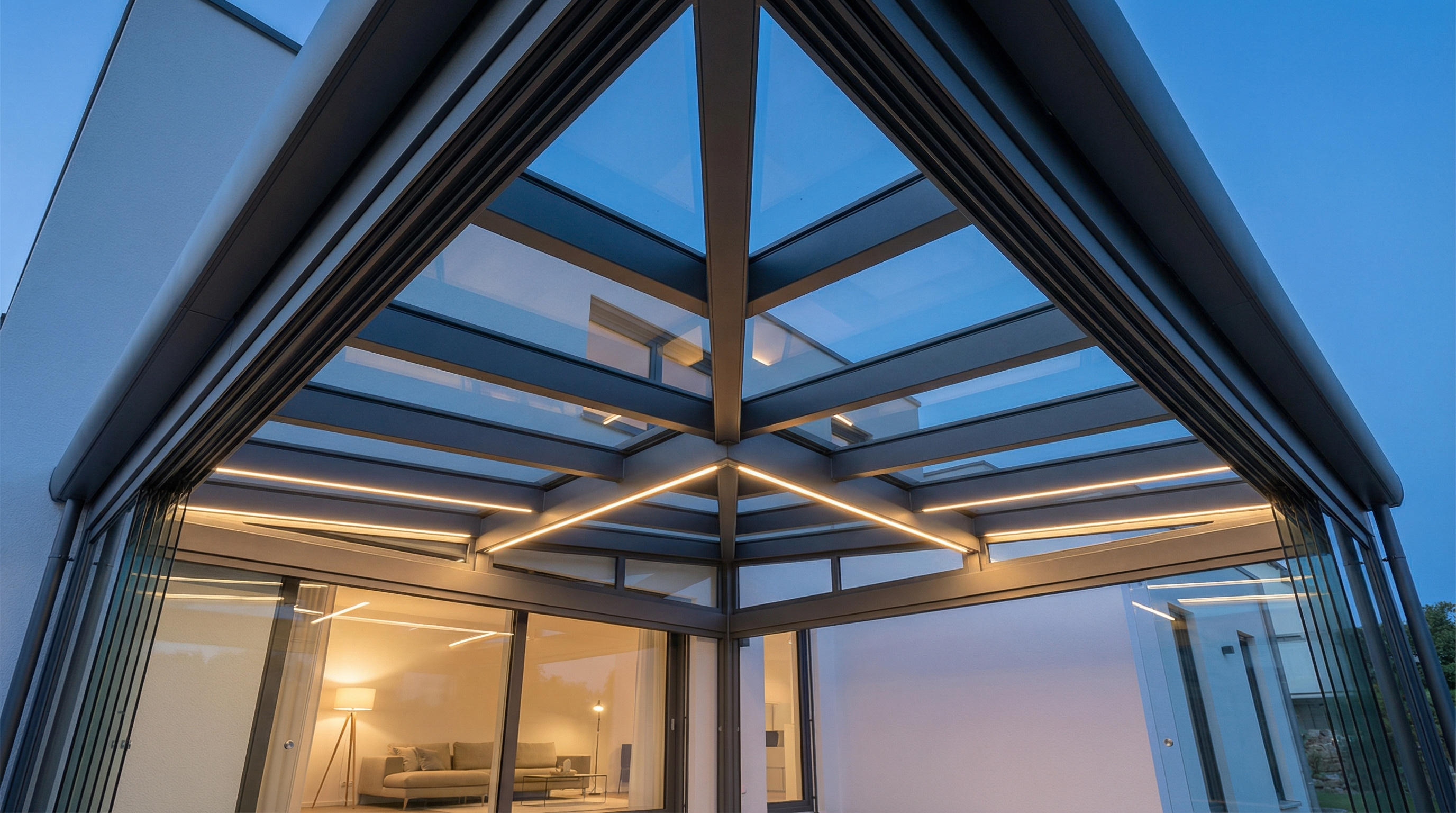 Rahmenlose Glaswände zum Öffnen und Schließen – verwandeln Sie Ihr Terrassendach in einen Kaltwintergarten.